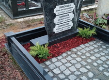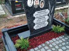 Подход был выбран комплексный. Мы сделали гранитный цоколь, заменили подставку (в будущем на левую свободную часть будет установлена ваза), уложили гранитную брусчатку на пол, оставили зону под будущие посадки цветов, посадили молодой можжевельник, закрыли землю мульчей, чтобы во время дождя земля не поднималась на гранит. И конечно, самое главное – мы сохранили гранитную плиту. Мы снимали ее, полировали лицо на станке и заново наносили надписи и изображение колосьев, обязательное требование заказчика. Мы также заменили фотокерамики на новые и долговечные. Работы была принята клиентом с воодушевлением.
