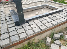 Изначально на участке находится лишь гранитный памятник прямоугольной формы и бетонный цоколь, который, по сути, бесполезен. Он не держит ограждение, не является фундаментом. Наша задача заключалась в следующем: уложить на данном объекте гранитную брусчатку.
