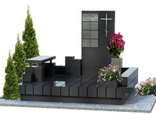 Строгость гранита разбавляют цветник и ваза. Вы сможете посадить цветы и будет место, где разместить принесенные букеты.