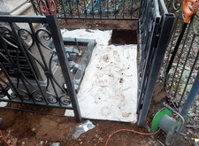 Пока велись восстановительные работы, мы уложили на территории участка геотекстиль, предварительно приварив к нижней части покрашенного ограждения металлический периметр, необходимый для укладки наземного покрытия. У подножья памятника в это же время был возведён цветник, выполненный из гранитных балок.