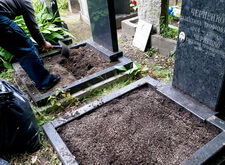 Сметаем с бортов цветника лишнюю землю, после чего переходим к самим надгробьям: вытираем памятники, немного проявляя надписи на их поверхности. Параллельно с этим протираем цветники, окончательно удаляя рассыпанную в процессе посадки землю.